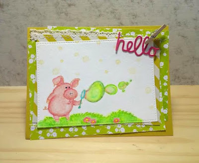 The sponsor generously provided some rubber stamps to work with, thank you so much! And with the color combo in my mind, I picked this super cute piggy image!